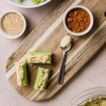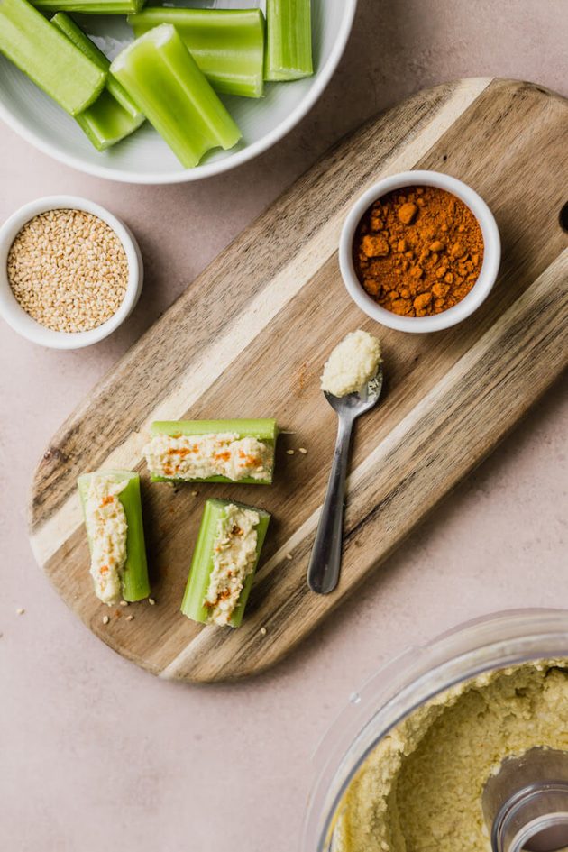 Nut-based hummus served alongside celery for the perfect plant-based keto snack.