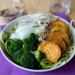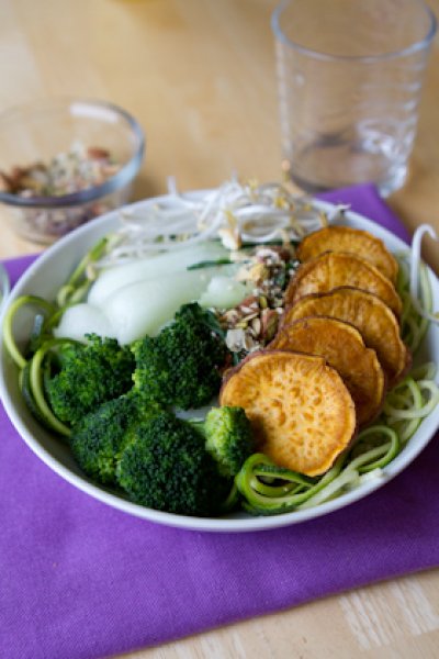 Soothing bowl of greens topped with sweet potato rounds, protein boost nut and seed mixture and homemade green dressing all served on a bed of zucchini noodles.