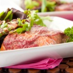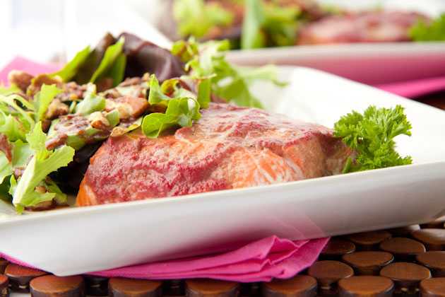Raspberry and ginger fill this salmon with delicious flavor and is paired nicely with a raspberry balsamic greens salad. A simple, easy, and light meal to end the summer.
