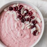 Frozen raspberries blended with collagen and full-fat coconut milk with extra healthful fats served in a bowl and topped with low-carb treats.