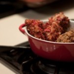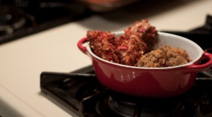 A healthful twist on breaded and baked chicken strips. Chicken coated with coconut milk and topped with root vegetable chips.