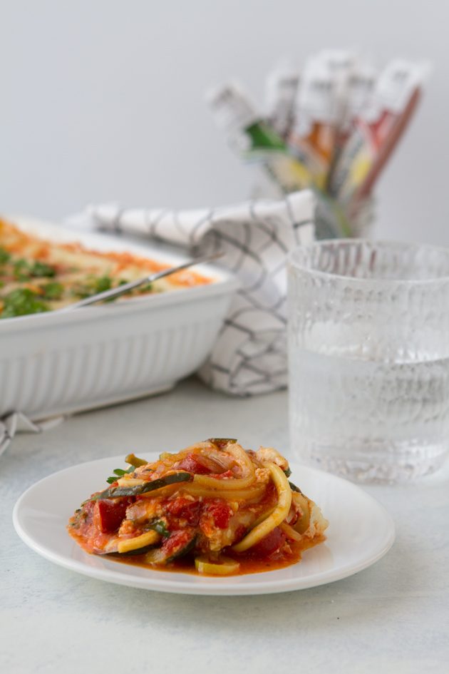 A keto sausage pasta bake recipe made with fermented beef sticks from Paleo Valley. Topped with a homemade melty dairy-free cheese.