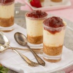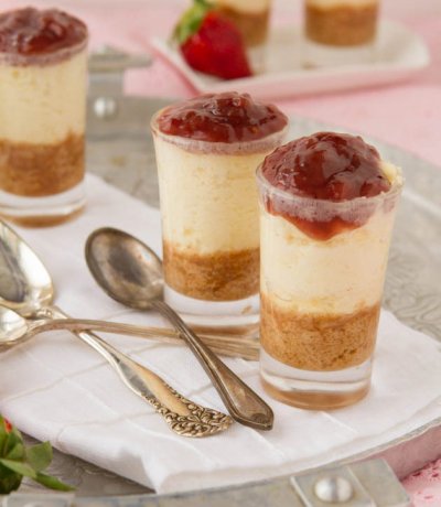 Mini strawberry cheesecakes made in shot glasses to control portion size… and to feel cute while eating them!
