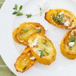 These roasted summer squash coins drizzled with oil and topped with fresh thyme make a simple side dish or elegant appetizer.