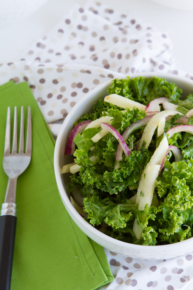 A raw kale salad recipe with raw jicama, red onions and a fresh pineapple, lime salad dressing.