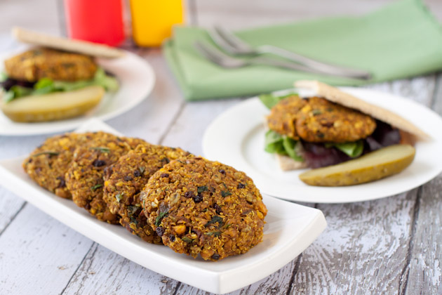 Biryani inspired quinoa burgers with dried currants, curry leaves and sunflower seeds.