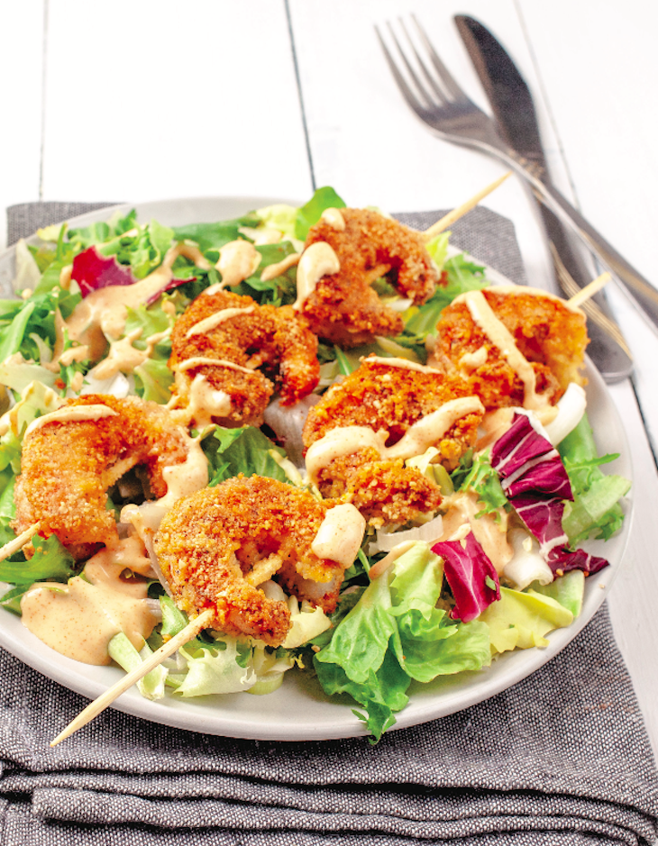 This salad couldn’t be easier to whip up. And the combination of the almond flour coating, the coconut oil used for frying, and the chipotle mayo dressing makes for one heck of a fat-bomb salad!